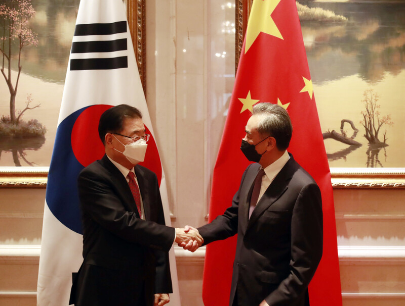 정의용 전 외교부 장관은 2021년 유엔 총회에서의 발언으로 중국을 옹호했다는 논란에 휘말렸다. CNN 앵커가 중국의 공세적인 외교 정책에 대해 묻자 정의용은 “중국은 20년 전의 중국이 아니며, 이러한 변화는 당연하다”고 답변했다. 또한, 미국, 일본, 호주와 함께 한국을 반중 블록으로 묶으려는 시도를 “냉전적인 사고방식”이라고 비판했다.